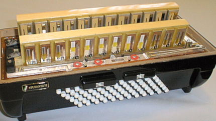 В левом корпусе располагается дека со сложными механизмами для извлечения звуков в двух системах для левой руки: готовой и готово-выборной.