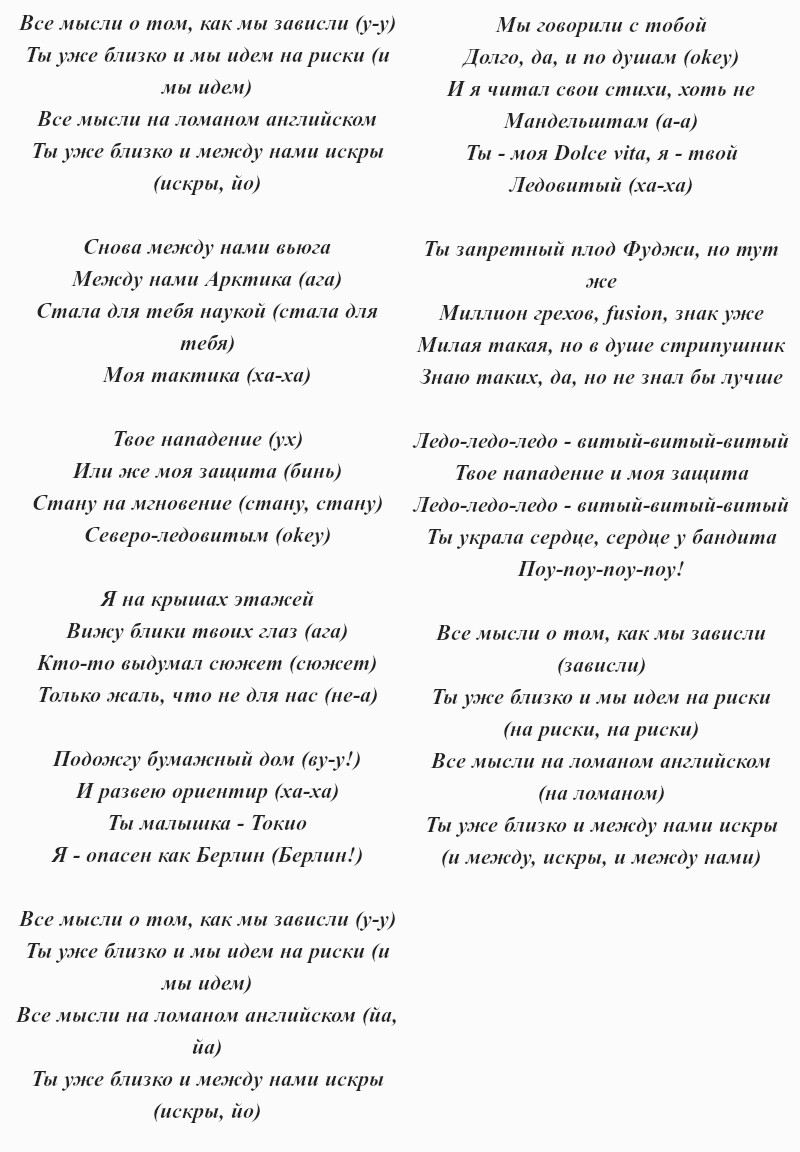 Красивое гитарное вступление и лёгкий саунд с качественно сведённым вокалом – что ещё нужно для хорошего хита? Упоминание Токио и Берлина в первом куплете – прямая отсылка к персонажам «Бумажного дома», которые полюбились миллионам зрителей по всему миру. Мот зарифмовывает отношения между героями в красивую лавстори, финал которой неизвестен никому.