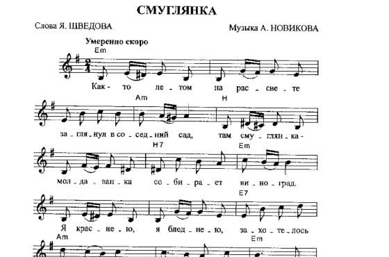 При написании «Смуглянки» её авторы вдохновлялись молдавским фольклором, поэтому произведение получилось лирическим, задорным и игровым. Впрочем, в довоенное время «Смуглянку» так никому услышать и не довелось, а когда началась война, ноты её были утеряны, и на руках у Новикова остались лишь черновики. Восстановив песню на их основе, композитор отправился на радио, где «Смуглянку» тогдашние редакторы раскритиковали в пух и прах, укорив Новикова в том, что на фоне столь тяжелых событий он предлагает песни о любви, свиданиях и расставаниях. Обескураженный автор отложил композицию «в стол», и в следующий раз достал её лишь в 1944-ом, когда на связь с ним вышел А.В. Александров – художественный руководитель Краснознаменного ансамбля. Александров интересовался новыми песнями, и Новиков решил снова попытать счастья со «Смуглянкой», предложив её совместно с остальными своими работами. Удивительно, но именно эта, не претендующая на военную «суровость», лёгкая и весёлая песня о любви больше всего приглянулась известнейшему музыканту.