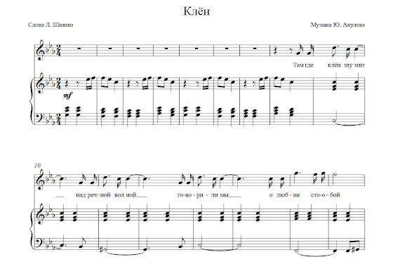 - К творчеству поэта – песенника Леонтия Шишко композитор Юрий Акулов обращался ещё до того, как переделал песню «Там, где клён шумит». На тексты талантливого поэта в 1964 году Акулов написал песню «Листья кленов», а в 1967 году – «Телефонный звонок», которые исполняла знаменитая эстрадная певица Майя Кристалинская.