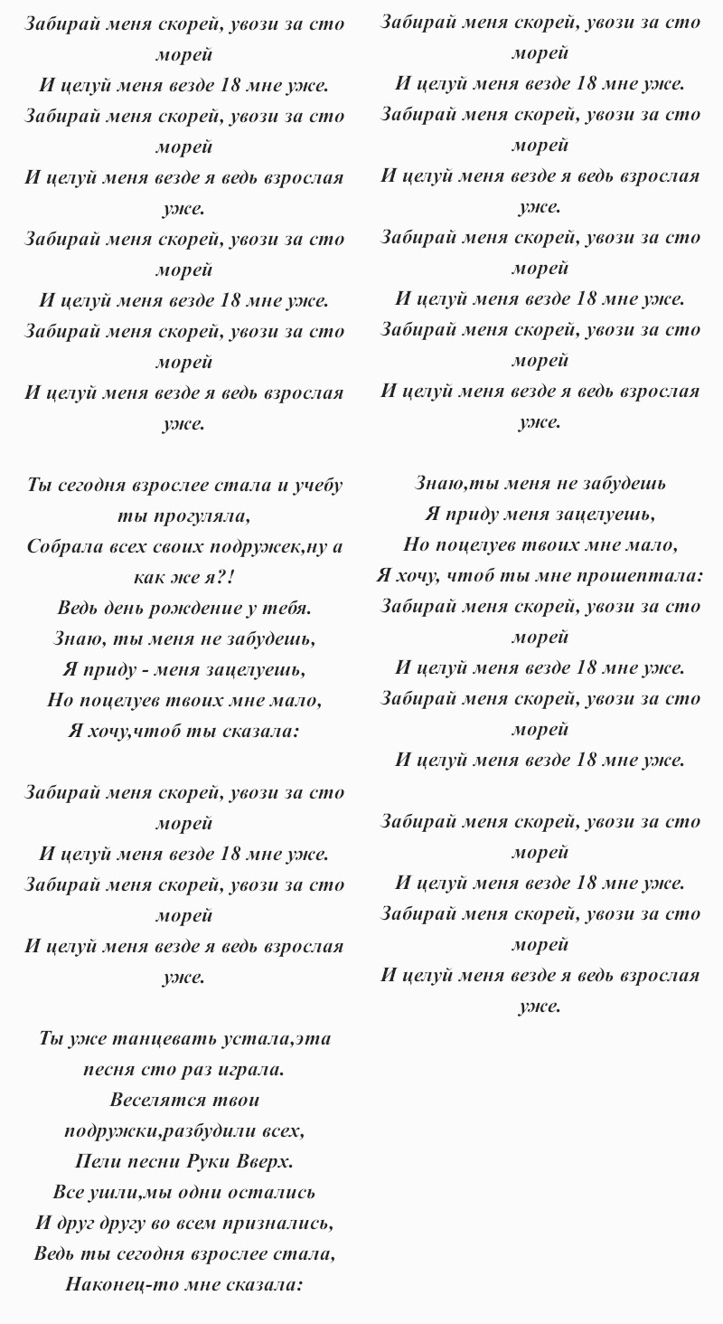 Историю создания песни «18 мне уже» («Забирай меня скорей»), а также интересные факты, текст и содержание композиции читайте на нашей странице.