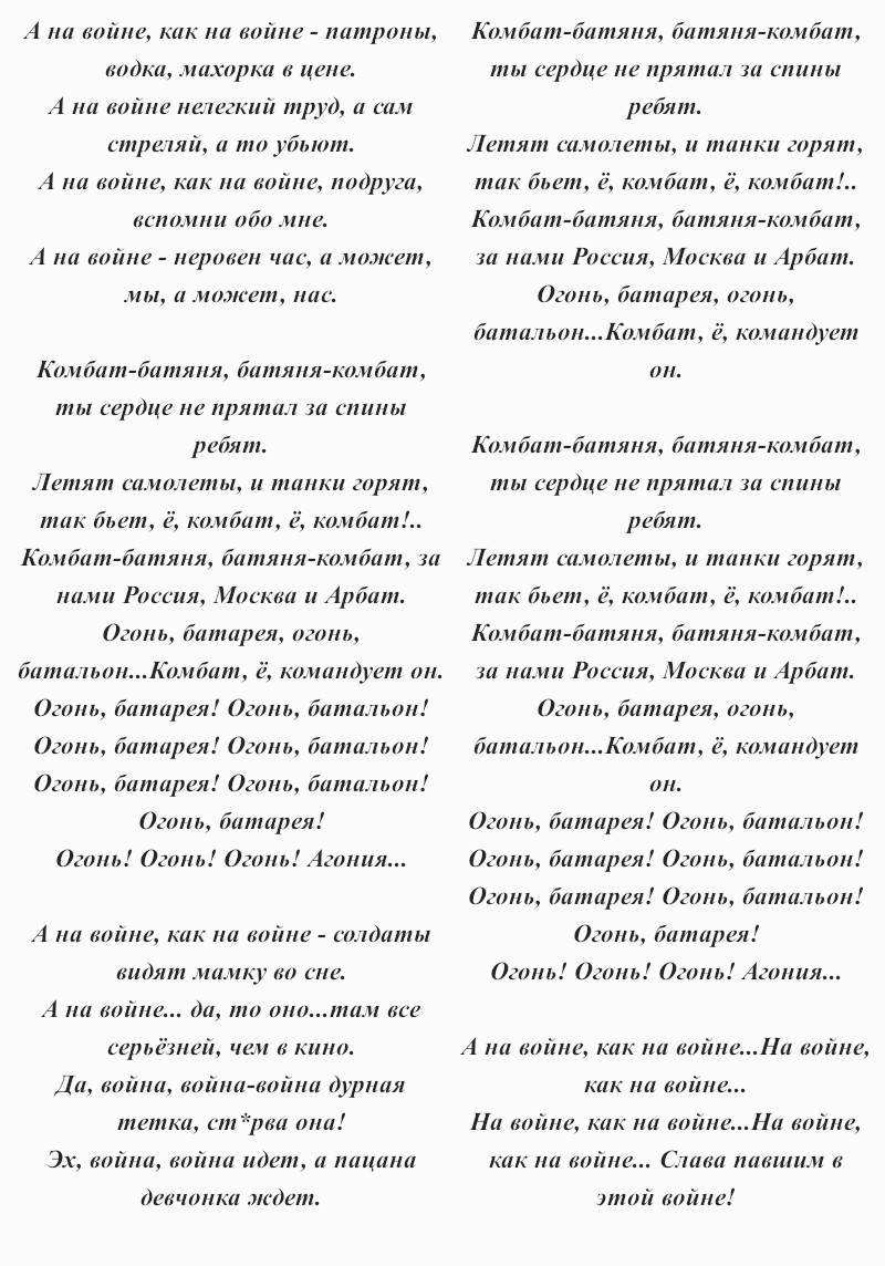 «Комбат» – шлягер более военный, нежели патриотический. Сюжет песни описывает «ангела-хранителя» молодых бойцов – командира батальона, для которого жизни подчинённых всегда стоят выше похвал от начальства и слепого следования приказам. Солдатское «спасибо» и уважение сослуживцев для него важнее любых орденов и звёзд на погонах.