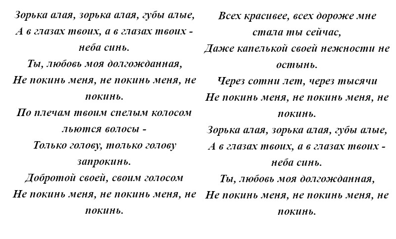 «Зорька алая». Данную глубоко волнующую и трогающую душу песню о любви нельзя назвать иначе, как изысканным признанием в светлых человеческих чувствах. То, что лирический герой называет свою возлюбленную «зорькой алой» говорит о многом. Он искренне, до замирания сердца, до мурашек любит даму своего сердца и обрисовывает её как самую яркую, нежную и красивую. По словам пылкого воздыхателя, образ его девушки впечатляюще пленителен. У неё алые губы, небесные глаза и волосы цвета спелого колоса. Такое непритворное признание говорит о настоящей любви, которую сам герой именует долгожданной, а потому молит свою желанную никогда его не покидать.