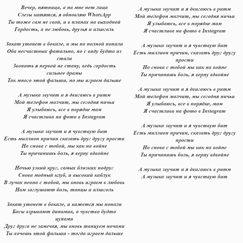 «Музыка звучит» — это простая, но довольно цепляющая композиция с актуальной смысловой нагрузкой. Как и музыкальное видео, трек отсылает к виртуальному миру: так, в тексте упоминаются «Instagram» и «Whatsapp». Однако в песне героиня не погрязла в параллельной реальности, а вместе с подругами идёт в клуб, где «двигается в ритм» музыке.