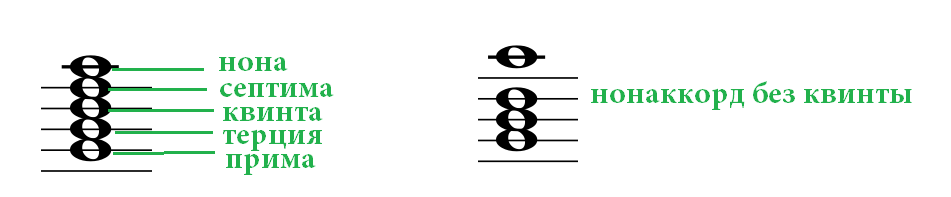Нонаккорд имеет в конструкции 5 звуков. В данном случае к предшествующим названиям добавляется нона. В музыкальной практике чаще всего используется нонаккорд без квинтового тона.
